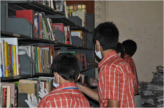 We all pitched in together and it turned out to be a big success. We all were tired in the end, but seeing our cleaned rows and books in order, we felt proud of our work. But, no success is great without a few ups and downs, so during our activity our major problem was we ran out of gloves, but we still managed to use what we had and pulled it off. After we finished our work we all sat down for a while and talked about our job. Slowly, we made our way to the buses happy and content with the work we had done that day.